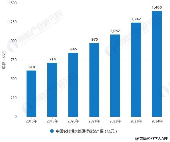 根据上述分析可知,由于我国农村供水安全堪忧、污染物排放逐年增加、污水处理覆盖率远低于城镇,而农村在我国二元城乡经济结构中占有重要战略地位,国家将下大力气推动农村水务事业发展,农村污水处理市场将迎来历史性发展机遇。2018年,农村污水处理行业大约形成了614亿元产值,预计到2024年产值将达到1400亿元。