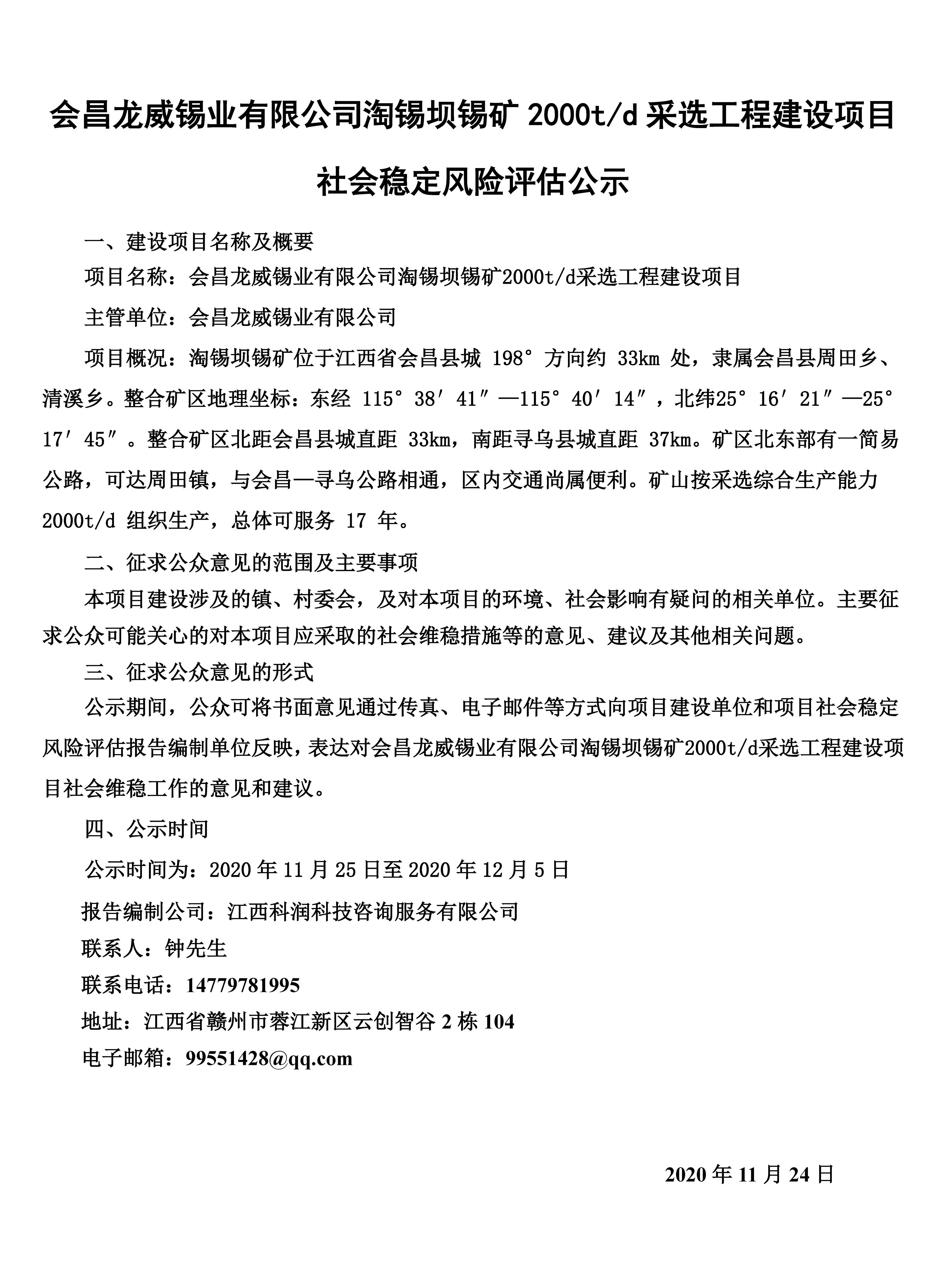 会昌龙威锡业有限公司淘锡坝锡矿2000t/d采选工程建设项目 社会稳定风险评估公示